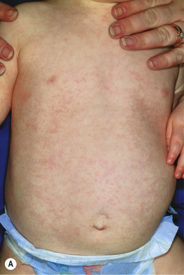 The majority of childhood exanthems are caused by viruses and less often by bacterial or rickettsial agents. Most childhood exanthems are diagnosed and managed by primary care providers, and thus a thorough familiarity with both classic and atypical exanthems is desirable for the pediatric primary care practitioner. When evaluating the patient with an exanthem, several features should be considered, including the morphology of individual lesions, the distribution pattern, prodromal and concurrent symptoms, known exposures, associated enanthem (eruption of the mucous membranes), local epidemiology, and the findings of a thorough review of systems and physical examination. Whereas some exanthematous processes present with a characteristic patterning of lesion morphology and distribution, others may reveal no pathognomonic features, and the cutaneous findings must be taken into consideration along with the overall presentation of the patient. Exanthems may be divided into erythematous, vesicular, and papular forms and have also been invariably described as morbilliform (“measles-like”), rubelliform (“rubella-like”), scarlatiniform (“scarlet fever-like”), or urticarial. Pustular and petechial changes may occasionally be noted.