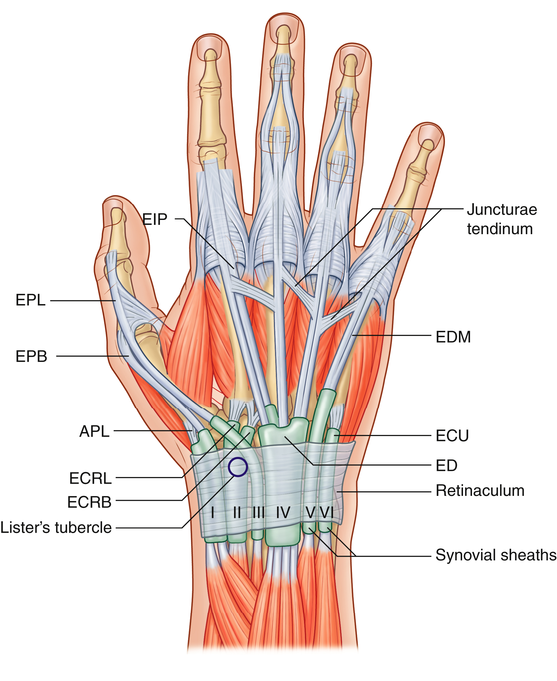 At the level of the wrist the extensor tendons pass under a synovial-lined condensation of the deep fascia called the extensor retinaculum ( Fig. 48.1 ). The extensor retinaculum has transverse and vertical fibers which form septae separating six compartments. From radial to ulnar the first dorsal compartment contains the APL and EPB while the second contains ECRL and ECRB. The third compartment contains EPL while the fourth contains EDC and EIP. The fifth compartment contains EDM and the sixth, ECU.