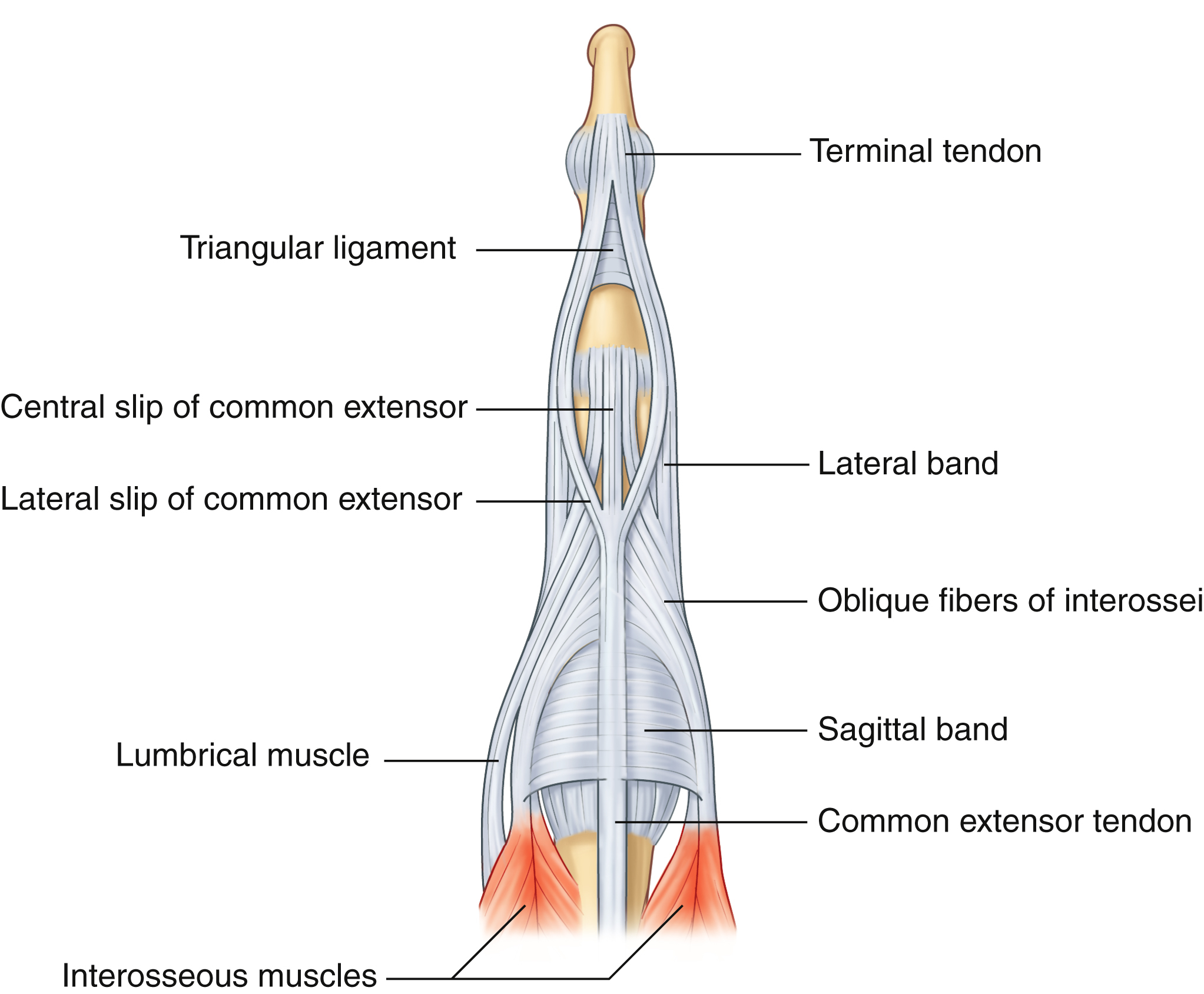 The transverse retinacular ligament extends from the conjoint lateral bands to the flexor sheath at PIP joint level, and acts to prevent dorsal dislocation of the lateral bands. The oblique retinacular ligament (ORL) connects the conjoint lateral band from the dorsum of the distal phalanx to the volar check rein ligaments at the PIP joint. The ORL thus lies volar to the PIP joint and sits dorsal to the axis of the DIP joint, allowing coordination of flexion and extension within those joints. The triangular ligament a fascial band connecting the conjoint lateral bands and the terminal tendon. It prevents volar subluxation of the conjoint lateral bands during PIP joint flexion.