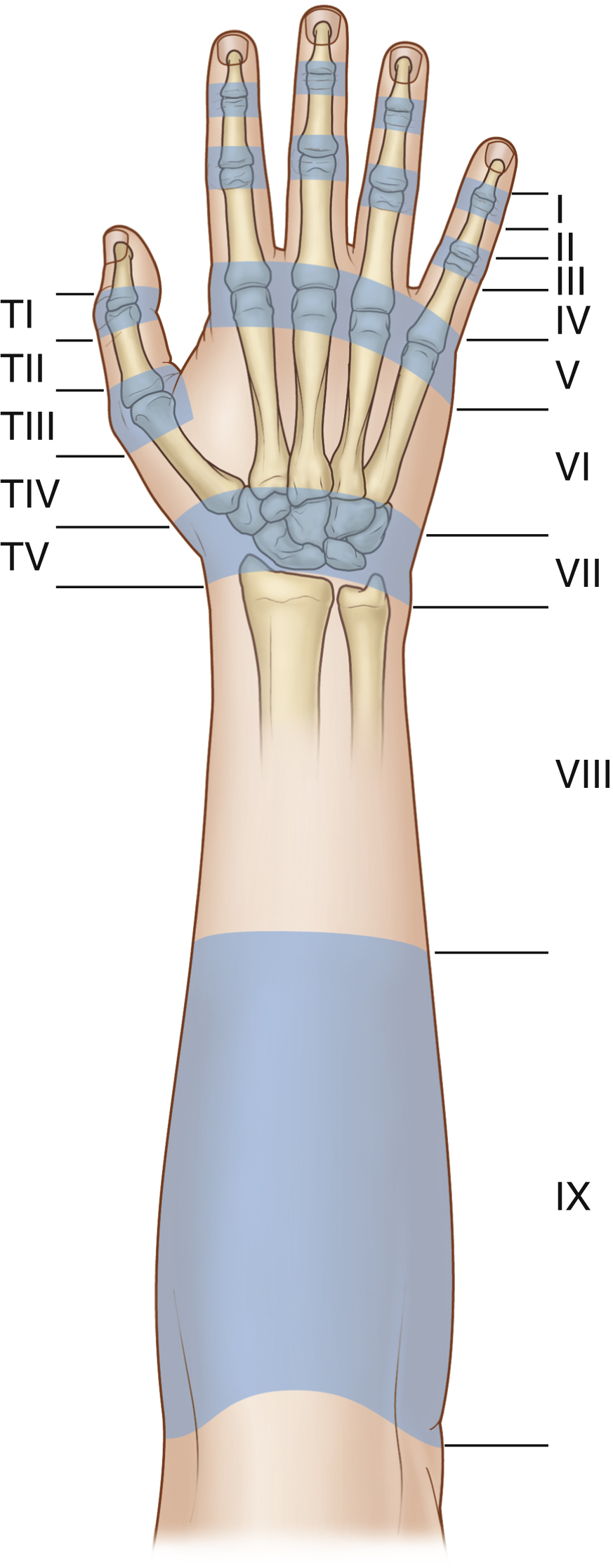 Kleinert and Verdan proposed a division of extensor tendon injuries into eight zones with an additional more proximal ninth zone proposed later by Doyle. The management of extensor tendon injuries is dependent on the zone of the injury. As an aide-memoire, excepting zone IX, odd-numbered zones are located over joints ( Fig. 48.4 ).