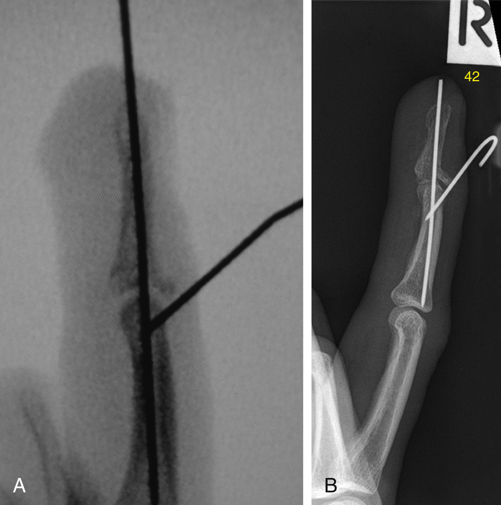 Closed extensor tendon avulsion fractures (mallet fractures) can be associated with volar subluxation of the distal interphalangeal joint. Subluxation is frequent in mallet fractures involving more than 50% of the articular surface of the base of the distal phalanx. Mallet fractures with no subluxation can be suitably treated nonoperatively by continuous splinting in full extension or slight hyperextension for 6 weeks followed by mobilization and night splinting for 2–4 weeks. Mallet fractures with subluxation are best treated surgically using a transarticular K-wire alone or in combination with a dorsal blocking wire ( Fig. 48.5 ). Rarely, if the fragment is substantial, other methods like interfragmentary screw, hook plate fixation or interosseous wire fixation can be used.