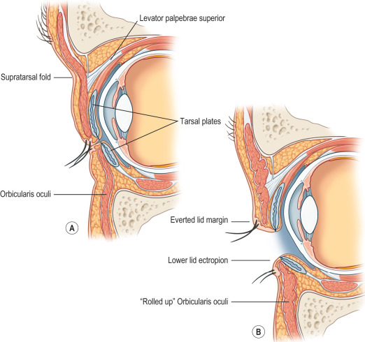 The periorbital region is notable for being very thin and an area with minimal to no subcutaneous fat, which results in burns that are generally deeper than similar burns suffered elsewhere on the body. We know that the depth of burn injury is dependent on numerous factors, including intensity of exposure, duration of exposure, and the associated epidermal and dermal thickness in the region of injury. The pattern of injury is also not typical and is dependent on these factors. Injuries that initially may appear to indicate partial-thickness involvement may progress to full-thickness if not managed appropriately. In the periorbital region, there is very little room for diagnostic or management error because the aforementioned facts make this area prone to devastating long-term sequelae. The delicate lamellar anatomy of the periorbital region must be considered in preservation of eyelid function and in any reconstructive efforts instituted in a treatment algorithm ( Fig. 4.3.1 ). There are excellent references that discuss the patterns of burn injury and the burn wound model as a dynamic, evolving process (for further exploration, see the References section).