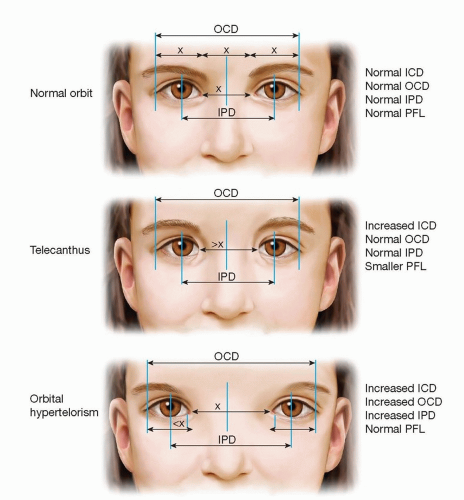 FIG 2 • Graphic representation of orbital measurements in the normal orbit, telecanthus, and orbital hypertelorism. ICD, inner canthal distance; OCD, outer canthal distance; IPD, interpupillary distance; PFL, palpebral fissure length. (Redrawn from Sharma RK. Hypertelorism. Indian J Plast Surg. 2014;47(3):284-292.)