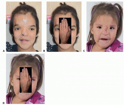 FIG 3 • A technique to determine whether a camouflage or medial wall procedure would be of benefit. Placing the hand in front of the medial naso-orbital region highlights the discordance of the lateral orbital regions. A,B. This patient looks abnormal with the hand obscuring the midorbital region and would benefit from a true orbital hypertelorism correction. C,D. This patient would benefit from nasal reconstruction alone.