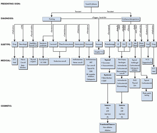 ALGORITHM 3.1.1 Treatment algorithm for facial erythema. CNS, central nervous system; D/C, discontinue; DM, dermatomyositis; LE, lupus erythematosus; NE, norepinephrine; SS, systemic sclerosis; SSRI, selective serotonin reuptake inhibitor; W/U, work up. (Courtesy of Macrene Alexiades, MD, PhD.)