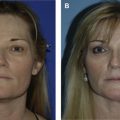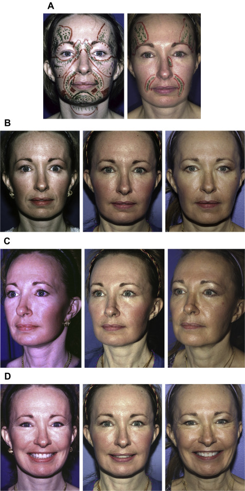 A 44-year-old woman with a past medical history of face-lift and lower and upper lid blepharoplasty presented with hollowing of the orbits, tear troughs, deepening of her nasolabial folds, loss of malar prominence, perioral rhytids, marionette lines, and loss of definition of her jawline. A total of 200 mL fat was harvested from her thighs and knees and processed using the Coleman technique. Fat was grafted in the right temple (6 mL), left temple (6 mL), glabella (1.5 mL), right medial eyelid (0.5 mL), left medial eyelid (0.5 mL), right anterior malar fold (1.5 mL), left anterior malar fold (1.5 mL), right anterior malar region (3 mL), left anterior malar region (4 mL), right lateral malar region (7 mL), left lateral malar region (8 mL), right nasolabial fold (7 mL), left nasolabial fold (5 mL), right buccal cheek (6 mL), left buccal cheek (4 mL), right mandibular jawline (4 mL), left mandibular jawline (4 mL), mental groove (0.5 mL), and submental region (6 mL). Two years later the patient was pleased with the result but desired minor enhancements. A total volume of 40 mL was harvested and grafted in the right temple (4.7 mL), left temple (3.5 mL), left side of her nose (0.6 mL), right nasolabial fold (1 mL), and left nasolabial fold (3 mL). Preoperative and 10-year postoperative photographs are shown in Fig. 1 . The patient has a lasting volume restoration and skin quality improvement.