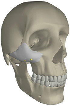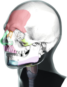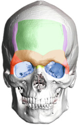 Green: forehead surface; purple: temporal ridges; light orange: supraorbital ridge (frontal bossing); dark orange: frontomalar buttresses; blue: eye sockets; yellow: frontonasal transition.