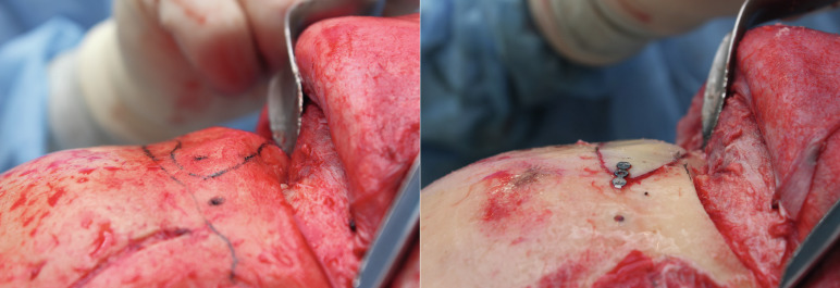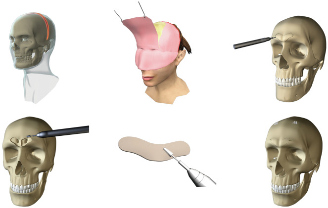 (Above, left) Modified coronal approach, with elimination of the scalp strip. (Above, center) Pericranial flap until supraorbital ridge and both frontomalar buttresses are reached. (Above, right) Osteotomy of the anterior wall of the frontal sinus using a saw. Access to the frontal sinus. The anterior wall is preserved in saline solution during skull contouring. (Below, left) Sculpture of the entire frontonasoorbital complex, paying special attention to the frontonasal transition. (Below, center) Elimination of bony interferences of the anterior wall of the frontal sinus. (Below, right) Stable fixation of the anterior wall of the frontal sinus with osteosynthesis and placement of resorbable anchors (Endotine Forehead-mini device, Coapt Systems Inc., Palo Alto, CA, USA) to correctly reposition the eyebrows over the new bone structure.