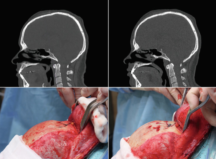 (Above) Pre- and postoperative sequence with sagittal computerized tomography (CT) images. (Below) Surgical before and after images of forehead reconstruction with osteotomy of the frontal sinus area; note the bone fixation method.