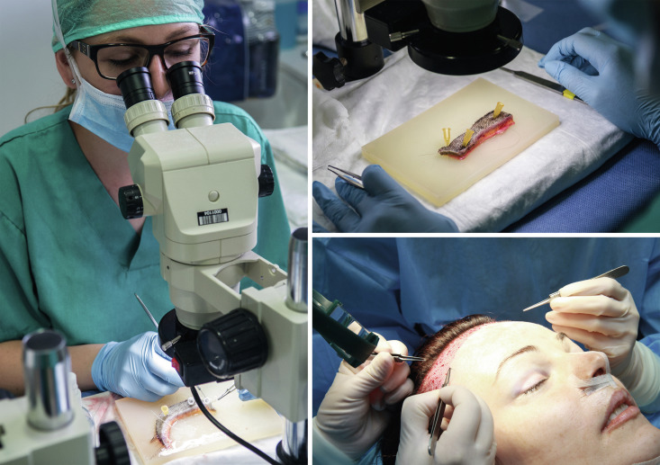 Obtaining follicular units from the strip taken during a modified coronal approach and surgical implantation.