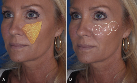 The main contributor to midface volume is the malar fat pads. They lie in the cheek with the base on the nasolabial fold and the apex on the malar region ( Fig. 7.1A ). The malar fat pads provide volume across the entire midface and with age, become atrophic and ptotic. The basis of implant selection lies in the recognition of where the aging changes have occurred and which implant would best restore youthful volume to that area. As patients age, they lose volume in the midface region. Volume loss can occur in the infraorbital region, the malar/submalar region, and the zygomatic region ( Fig. 7.1B ).