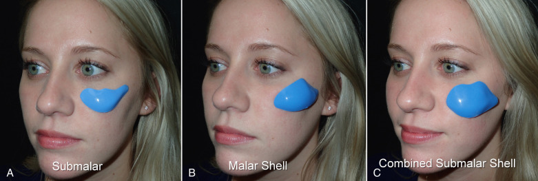 The third type of common midfacial aging change is seen in the patient with submalar deficiency and malar deficiency and this requires combined augmentation. These patients benefit from both anterior maxillary (submalar) fill and malar (“high cheekbone”) augmentation. These can be patients who have lost volume in both areas, or those patients who have underdeveloped skeletal anatomy. Such patients are well suited for treatment with the combined Submalar Shell Implant ( Fig. 7.2C ). This implant is designed to augment the submalar region as well as zygomatic and malar regions constitutes 4–5% of my implant cases. It is actually a combination of the submalar and malar configurations in a single implant. This configuration tends to run large, and generally a small to medium implant is adequate for the average patient. The larger the implant footprint, the larger the surgery and recovery. For decades, I have successfully treated virtually all forms of midface deficiency with the three aforementioned implants. Again, the submalar configuration is 95% of cheek implants I place. Fig. 7.3 shows the common types of midfacial deficiency and Fig. 7.4 shows the approximate skeletal positioning of the described implants.
