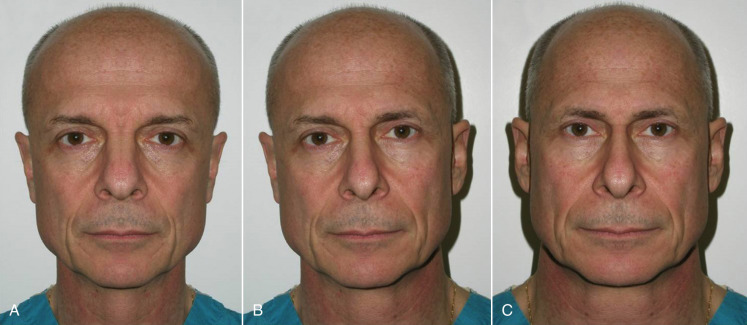 It is important to note, discuss, and document existing asymmetries with the patient before surgery. It is common for patients to have one side of the cheeks or midface bigger than the other. In extreme cases, a medium implant may be placed on one side and a large implant on the other, etc. Most frequently, the degree of asymmetry is such that it does not alter the final result when using the same implant on both sides. To illustrate the difference in symmetry, I keep a picture of me in each consult room that shows my normal portrait and a mirrored image of the right and left halves of my face ( Fig. 7.5 ). The difference is remarkable, and I explain to the patient that the average person has similar asymmetry. I have often had to construct a similar image of a patient to show them their own asymmetry.
