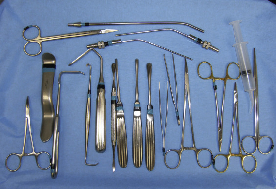 The surgical armamentarium is relatively simple for midface implant placement and does not require highly specialized instruments ( Fig. 7.7 ). A Molt No.9 periosteal elevator, a long thin-tipped tonsil hemostat, an Aufricht nasal retractor (fiber optic is preferable), and a Minnesota cheek retractor are useful instruments.