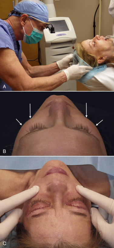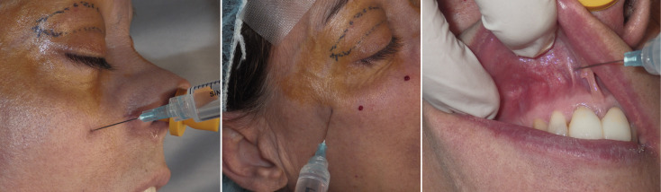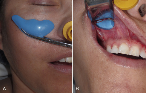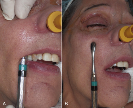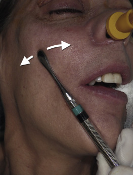 The procedure is begun by injecting about 5 mL of 2% lidocaine, 1 : 100,000 epinephrine transcutaneously in the subperiosteal plane along the region to be dissected. Since many surgeons outline the implant on the cheek, the marked area serves as a template for local injection, and the local is injected 1 cm past all margins. This usually includes the anterior maxilla, malar region, and anterior zygomatic arch region. Additionally, approximately 3 mL of the same anesthetic are infiltrated in the soft tissue planes in the mouth above the canine tooth, primarily to reduce incisional bleeding ( Fig. 7.8 ).
