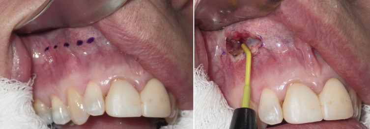 A 1-cm horizontal incision is made approximately 10–15 mm above the canine tooth. Using a radiowave or electrosurgery microneedle to incise the mucosa and soft tissues is hemostatic, and the incision is carried to the periosteal level of the canine fossa region ( Fig. 7.9 ). Alternatively, a vertical mucosal incision can be used but this approach provides less visual and working access compared with a horizontal entry. It is very common to see bleeding from the vascular rich mucosa and this is immediately cauterized with a small bipolar forceps to prevent bleeding throughout the case ( Fig. 7.10 ). The oral mucosa is very pliable, and even with a small incision, the surgical site can be well visualized when retracted. The incision continues to the periosteum and the entire dissection must remain subperiosteal. A Molt No.9 periosteal elevator is used to begin the subperiosteal dissection.
