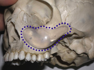 After the anterior maxilla is dissected, the periosteal elevator is angled, and the remainder of the dissection is primarily in an oblique vector ( Fig. 7.13 ). All of the common implants extend over the lateral maxilla and zygomatic regions and taper out to a thin tail. This oblique vector of dissection is carried out over the malar region and extends over the medial portion of the zygomatic arch. It is extremely important to remember that the implant pocket should be just slightly larger than the intended implant ( Fig. 7.14 ). A grossly larger pocket only serves to encourage mobility and dead space. This is even more important if screw fixation is not being used, so the smaller pocket will retain the implant and reduce mobility.
