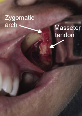 For small or medium submalar implants, minor zygomatic dissection is required, but for combined submalar and malar shell implants, more aggressive malar and zygomatic dissection is necessary. These larger implants also require more aggressive inferolateral dissection. It is not uncommon to encounter the origin of the masseteric tendon (or muscle) while dissecting in the area ( Fig. 7.15 ). There is no need to violate or dissect this tendon or muscle, because the silicone implant can safely lie over these soft tissue structures without a problem and frequently do with the larger-style implants. If adequate dissection is not performed over the masseteric tendon, it can create an obstruction and not allow the implant to sit passively. For smaller implants such as the medium submalar, the extended dissection over the masseteric tendon is usually unnecessary.