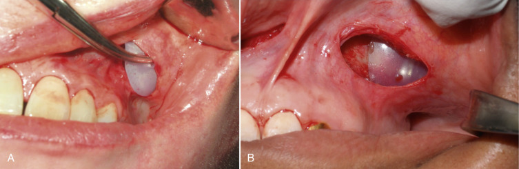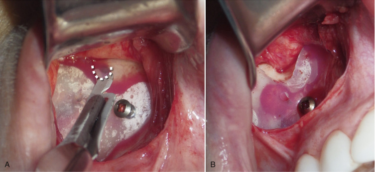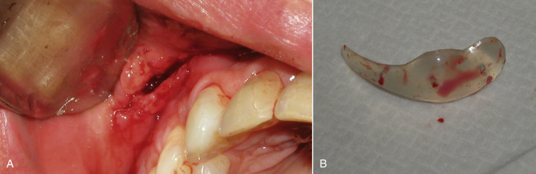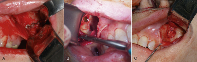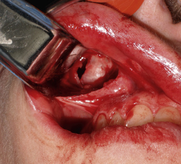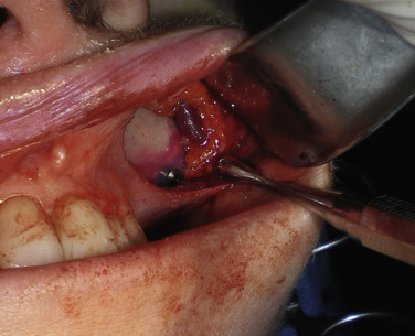 Some patients have extremely thin “potato chip” bone on the maxillary sinus and this can be easily perforated or fractured during routine dissection ( Fig. 7.54 ). This is most often seen with novice surgeons but can occur with any surgeon. If a moderate perforation occurs during implant dissection, the procedure can continue and the implant can lay over the perforation. The surgeon must take care not to allow debris to fall into the sinus through the perforation. Since patients are already on antibiotics from the implant procedure, no other coverage is necessary unless the patient becomes symptomatic with sinus-related problems. An antral perforation may result in bleeding from the nose as blood that entered the sinus may drain, but this is not active hemorrhage and is self-limiting.