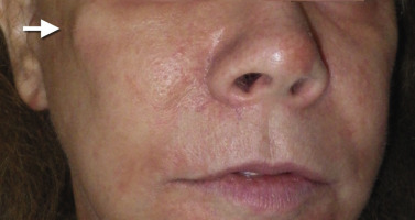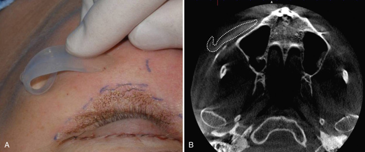 Fig. 7.49 shows a patient who had a springy palpable prominence over the zygomatic arch region because the implant tail had folded under the implant body during placement as discussed earlier in this chapter (see Fig. 7.22 ). The implant was removed and the tail successfully repositioned. Fig. 7.50 shows a patient whose implant has migrated superiorly, and the implant border became palpable at the orbital rim. This bothered the patient during animation and the implant was removed, trimmed, and successfully repositioned.