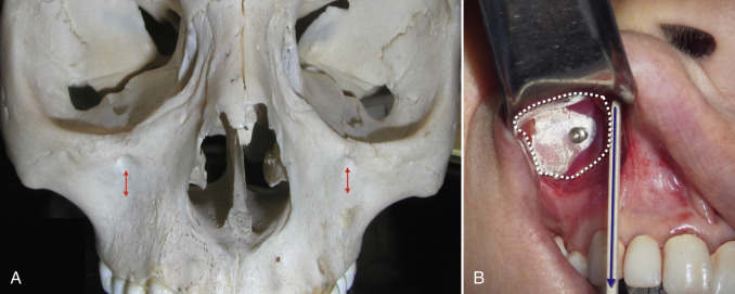 An additional constant for medial/lateral position is to use a caliper to measure laterally from the piriform aperture, but this is frequently obscured as the dissection do not extend that far. The implants should not extend grossly below the zygoma when placing a finger inside the mouth in the maxillary sulcus. If the implants are grossly palpable into the sulcus, they need to be repositioned superiorly as this low position will bother the patient as well as possibly erode the mucosa. Several millimeters of palpable implant in the upper sulcus is not a problem.
