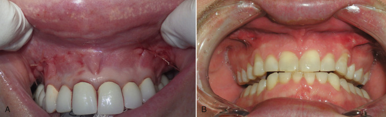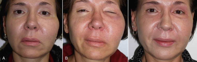 No dressings or compressive head gear are placed or worn after surgery. Postoperative care includes analgesics, antibiotics, and a 5-day course of prednisone (60 mg/day for 5 days). The patient is instructed to refrain from significant talking or animation for the first 48 h and is asked to follow a liquid or soft diet for the same time period. Ice packs are used for the first several days. The amount of swelling can be quite variable. Some patients look great at 3 days, but others may have significant swelling for several weeks. No immediate follow-up care is required, as the sutures are resorbable ( Fig. 7.33 ). Postoperative appointments are generally scheduled for 2 weeks, 1 month, and 3 months. One caveat is be aware of a patient that reports new or unusual swelling as that could represent hematoma or seroma.