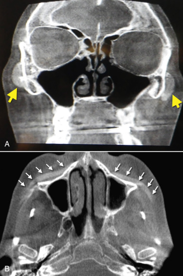Although silicone implants are radiolucent, they can be visible by enhancing some CT scans and the titanium screws are always visible ( Fig. 7.34 ).