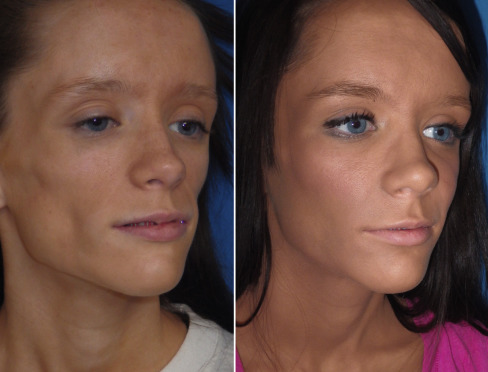Implant malposition most frequently occurs in non-fixated implants, although it is possible (rarely) for a fixated implant to rotate on a screw or in rare cases the implant can dislodge from the screw. Talking, excessive chewing, excessive animation, sleeping on one’s side and smoking, are all activities that should be minimized for the first postoperative week. There is probably some asymmetry that occurs with all implant cases and small differences usually go unnoticed and blend with the subtle asymmetries of nature. Larger asymmetries may be very visible and warrant correction. When this occurs, the patient must decide which side they prefer and the contralateral implant is then repositioned to match. Fig. 7.48 shows a patient with her right cheek implant placed more inferiorly than the left. The right side was repositioned superiorly, and the patient was happy. If a frank preoperative asymmetry is apparent, then this can be compensated for by placing a larger or smaller implant on one side to compensate for the asymmetry. I have done this several times, where I placed a large implant on one cheek and a medium on the other.