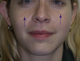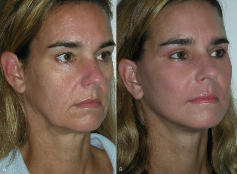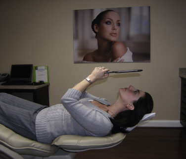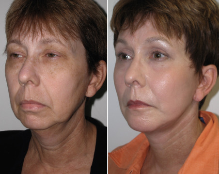 Most patients and many aesthetic practitioners are unaware of this midfacial volume loss after the third decade. If the surgeon hands the patient a mirror and asks them to smile, the ptotic tissues are elevated, which produces a more youthful look. This simulation will cause many patients to comment. If you hold the elevated tissues in place with your thumb and index finger and ask the patient to relax their smile, the midface volume quickly drops to its aged position lower in the face when the fingers are relaxed. In essence, the youthful cheek fat later becomes the jowls with aging. As mentioned previously, the most efficient means of pointing out midfacial volume loss and the result that cheek implants would have is to recline the patient in the exam chair. This will “reposition” the aging and ptotic tissues to a more youthful position and can be used to illustrate aging and improvement and serve as a “surgical prediction” ( Fig. e7.1