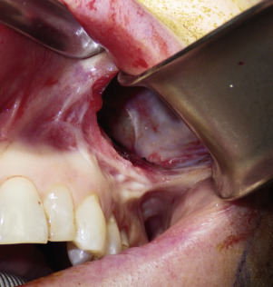 After the superior and superolateral dissection, a final sweeping maneuver is made with the periosteal elevator ( Fig. 7.17 ). This assists in developing the full pocket for implant placement. It is imperative that the subperiosteal dissection is totally free of adhesions that would impede passive implant placement. The surgeon can also insert the forefinger and use the fingertip to stretch the underside of the cheek for increased freedom. Care must be utilized to not over-stretch the area which could possible damage the facial nerve branches. One of my personal means of deciding if adequate dissection is achieved is the ability to place the working end of the Minnesota retractor fully inside the lateral dissection pocket ( Fig. 7.18 ).