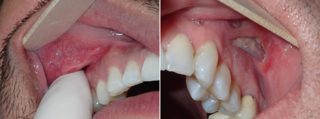 Infection has been an uncommon experience. It usually manifests in the first week or two after surgery. Infection generally presents as one side failing to heal, pain, increased swelling, periorbital edema, and purulent drainage with a bad taste in the mouth ( Figs. 7.44–7.46 ). The incision site will frequently be very inflamed and sometimes open. It is possible to salvage a minor infection with open incision and drainage, irrigation, and systemic antibiotics. If an implant becomes infected and is secured with screw fixation, I will attempt salvage with incision and drainage, antibiotic rinses, and systemic antibiotics. The lack of mobility assists in healing. In my experience, attempting to salvage a mobile, unfixated implant is futile and should not be attempted. Resistant infections warrant implant removal, and the implant can be replaced after healing. Because the explanted site will have scar tissue and remnant implant capsule, the result is sometimes unnoticeable. On occasion, I have taken out a single implant and not replaced it, without any noticeable cosmetic deficit. In other cases, the deficient side is noticeable and must be reimplanted.