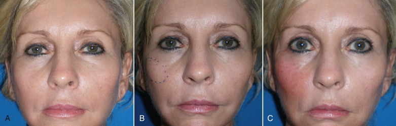 The second type of common facial aesthetic deficiency is apparent in patients who have adequate submalar and anterior maxillary fill but have deficient malar regions . This is the patient who has hypoplasia of the zygomatico–malar regions or simply desires a more defined or “chiseled” appearance, or in layman’s terms, “higher cheekbones.” I treat these patients with the Terino Malar Shell Implant, which I now rarely use ( Fig. 7.2B ). The isolated high cheekbone look was popular several decades ago with the “waif” look, but contemporary patients generally seek a more balanced appearance.