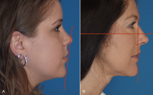 When considering the relationship of the chin harmony to the rest of the face, many factors come into play. I feel that profile enhancement is never a “one look fits all” type of situation. Many types of standardized cephalometric and soft tissue measurements are available to determine optimum chin projection. While these are helpful, the astute surgeon will realize that many other influences contribute, including the shape of the neck, cheeks, and nose. A “boilerplate” approach may not look natural on some patients. The best surgeons also realize the variability in faces and their proportions and, with experience, can usually determine “what looks natural.” Riedel’s plane is a commonly used analysis. This involves placing a straight line through the most protrusive portions of the upper lip and lower lip (labrale superius, LS) and labrale inferius, LI) that intersects the soft tissue pogonion. An ideal position is when this line touches both lips and the tip of the chin. If the chin is posterior to the line, the patient is recessive; if the chin is anterior to the line, the patient has chin excess ( Fig. 7.56 ). The Gonzalez–Ulloa analysis (also the called “zero meridian”) has a horizontal line representing the Frankfort horizontal plane and a vertical line that intersects the horizontal line at a 90-degree angle through the soft tissue nasion. In an ideal profile, the line should intersect the most anterior soft tissue projection of the chin (soft tissue pogonion). As with the Reidel plane, a deficient chin will follow posterior to Gonzalez-Ulloa line and a horizontally excessive chin would fall anterior to the line. With either of these analyses, surgical distances can be estimated assuming the photographs are standardized (1 : 1 ratio). If a patient with a deficient chin has the vertical line that lies in front of the chin by 8 mm, then the surgeon can estimate an 8 mm implant projection or osteotomy advancement. Remember, these are estimates and not absolute measurements or analyses.