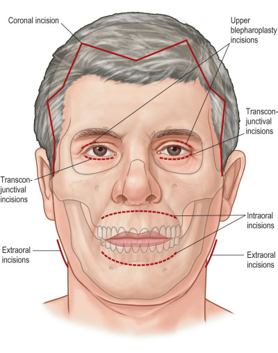 Access to the craniofacial skeleton can be achieved through strategic incision placement ( Fig. 9.1 ) .