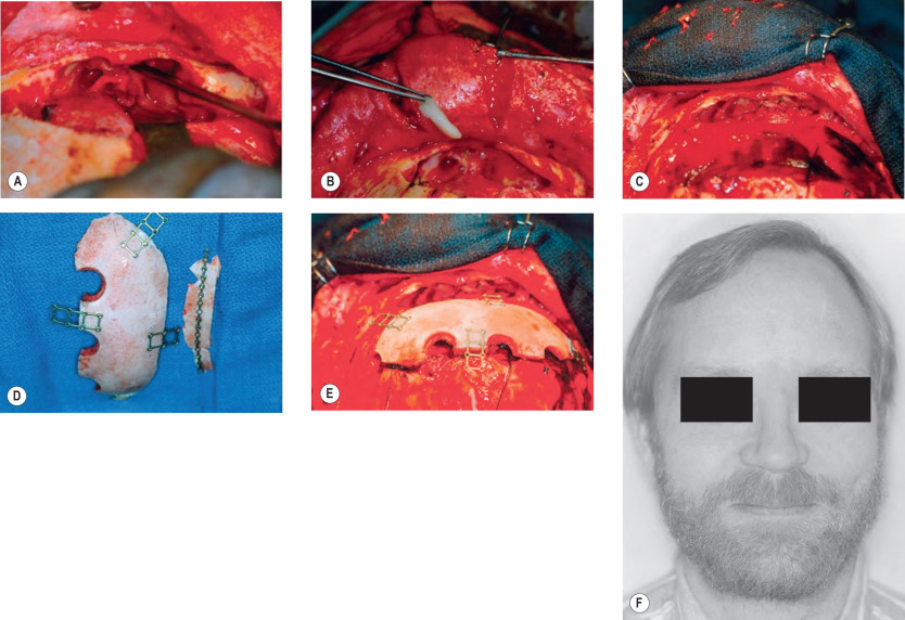 (A) Nasofrontal duct. (B) Bone plug for nasofrontal duct and galeal flap. (C) Bone obliteration of frontal sinus. (D) “Back table” surgery for bone replacement. (E) Bone reconstruction and cranialization of the frontal sinus; intracranial neurosurgery. (F) Postoperative result.