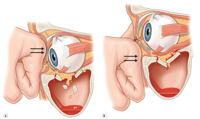(A) Mechanism of blow-out fracture from displacement of the globe itself into the orbital walls. The globe is displaced posteriorly, striking the orbital walls and forcing them outward, causing a “punched out” fracture the size of the globe. (B) “Force transmission” fracture of orbital floor.