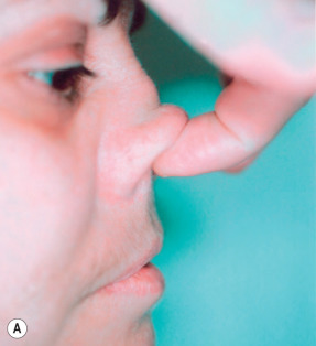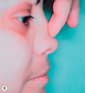Palpation of the (A) columella and (B) dorsum detects superior rotation of the septum and lack of dorsal support. There is an absence of columellar support and dorsal septal support.