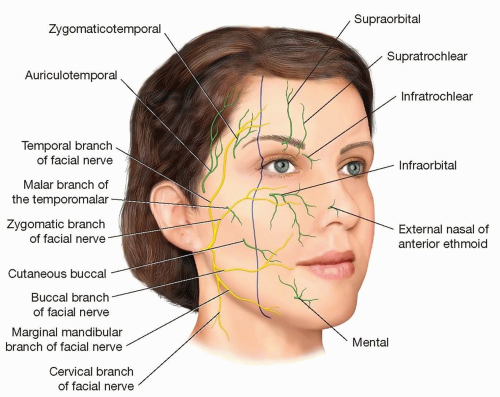 • The sensory nerves of the face can be utilized as guidelines for local anesthesia nerve blocks. Suspicion for nerve laceration should be elevated when lacerations are present in these regions.