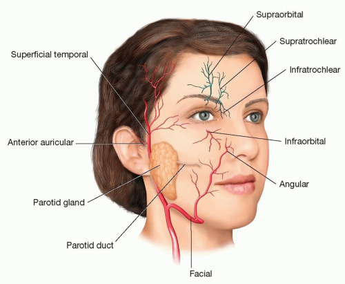 FIG 3 • The major arteries of the face. These arteries arise from the external carotid system (in red) and the internal carotid system (in green). Path of the parotid duct or Stensen duct. Lacerations in this line should be evaluated for laceration of the parotid duct system.