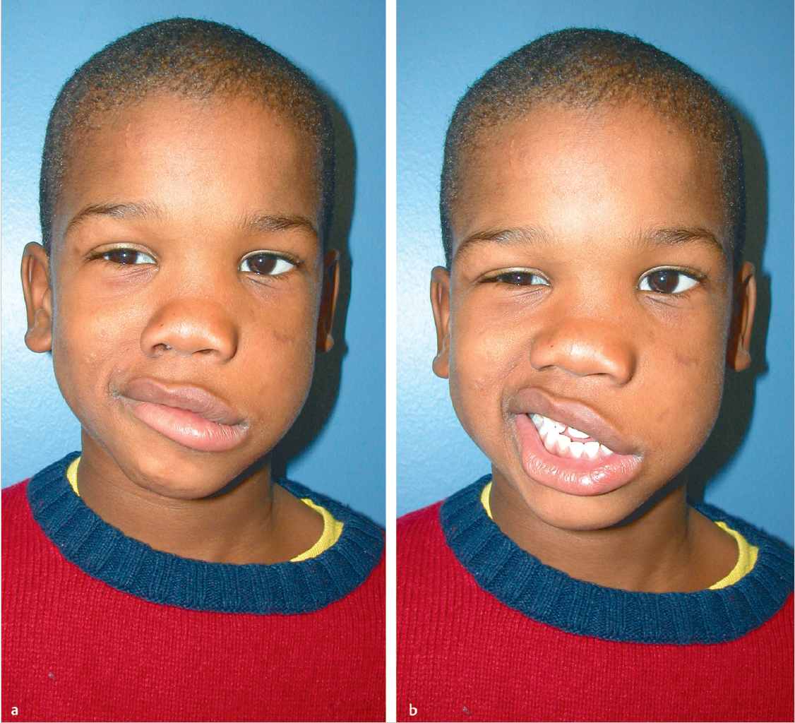 Facial asymmetry: Left palpebral fissure widening, left nasolabial fold effacement, right-sided deviation of Cupid′s bow, and inferior malposition of the left oral commissure, which demonstrates no movement with smiling.