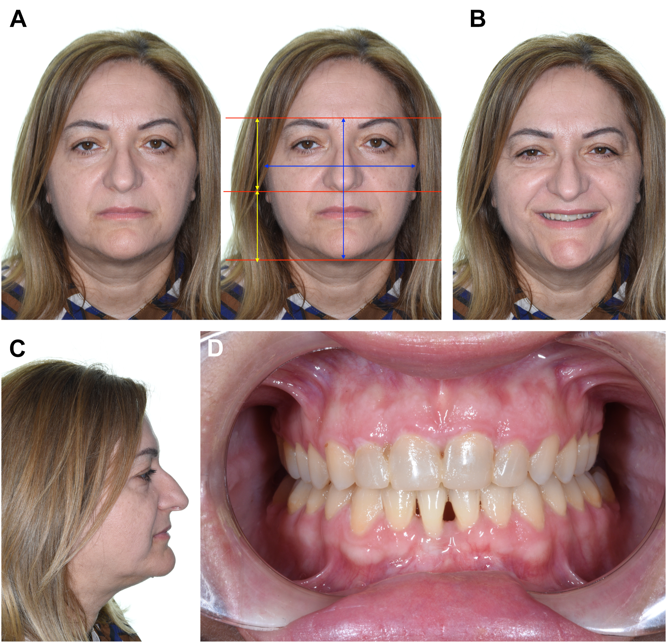 The posttreatment photographs demonstrate increased lower face height and improved facial W/H ratio (W/H ≅ 1.0) ( Fig. 2 A , right), increased upper lip length and nicely unfolded lips with normalized volume, softer nasolabial folds ( Fig. 2 A, left), straightened profile ( Fig. 2 C), adequate tooth exposure when smiling ( Fig. 2 B), and corrected occlusal relationships with temporary restorations on the anterior teeth ( Fig. 2 D). Any additional cosmetic medical intervention could have a synergistic effect, resulting in a multiplicative enhancement of the esthetic benefits for the patient.