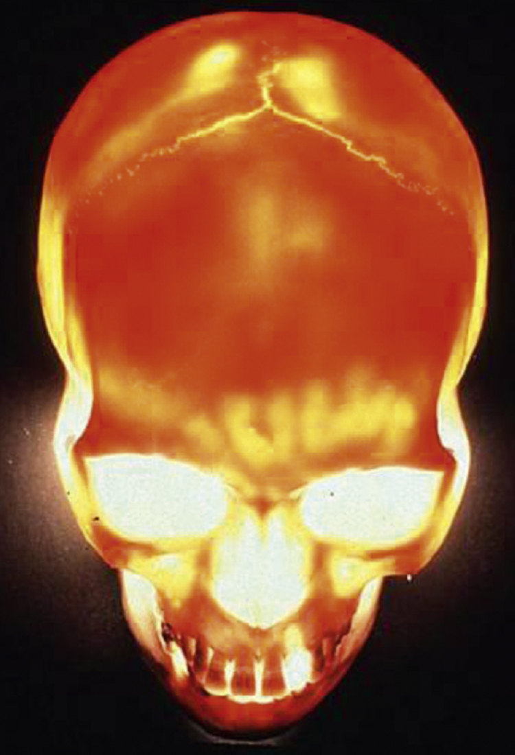 A transilluminated adult skull demonstrates the paranasal sinuses and the supporting buttresses of the face.