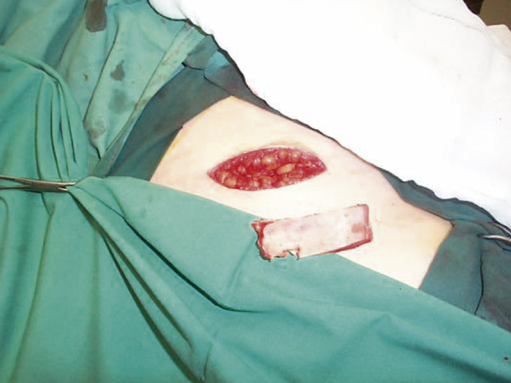 Rib grafts are harvested through a submammary incision, cartilage can be taken in the form of the costochondral junction for use in the nose and the temporomandibular joint. Ribs can be used whole or more usually split for calvarial or orbital reconstruction ( Fig. 34.5 ).