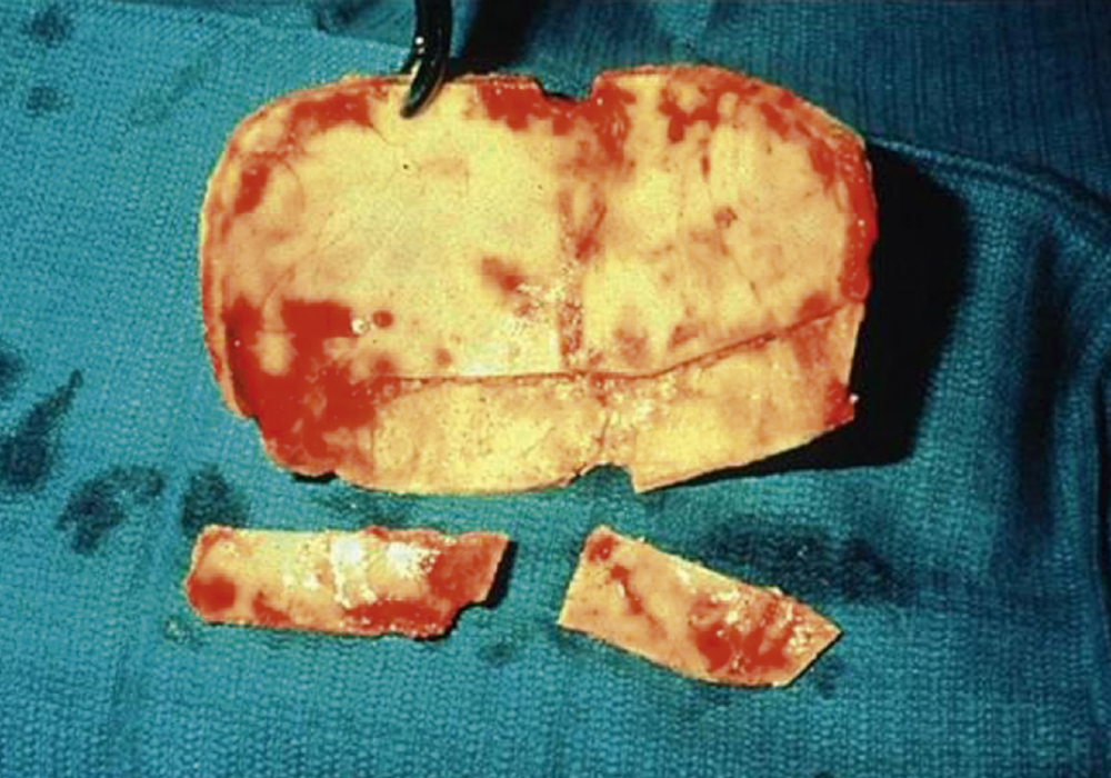Calvarial grafts have the disadvantage of being less malleable than hip or rib grafts. Small portions can be taken from the outer table where the skull is thick enough, obviating a need for extra visible scars, however contour defects of the skull are often a problem as are complications arising from damage to the underlying dura and brain arising from inexperienced operators. The inner table can be harvested when a craniotomy is being performed and the bone is thick enough. Good quantities of high-quality bone can be obtained in this fashion ( Fig. 34.6 ).