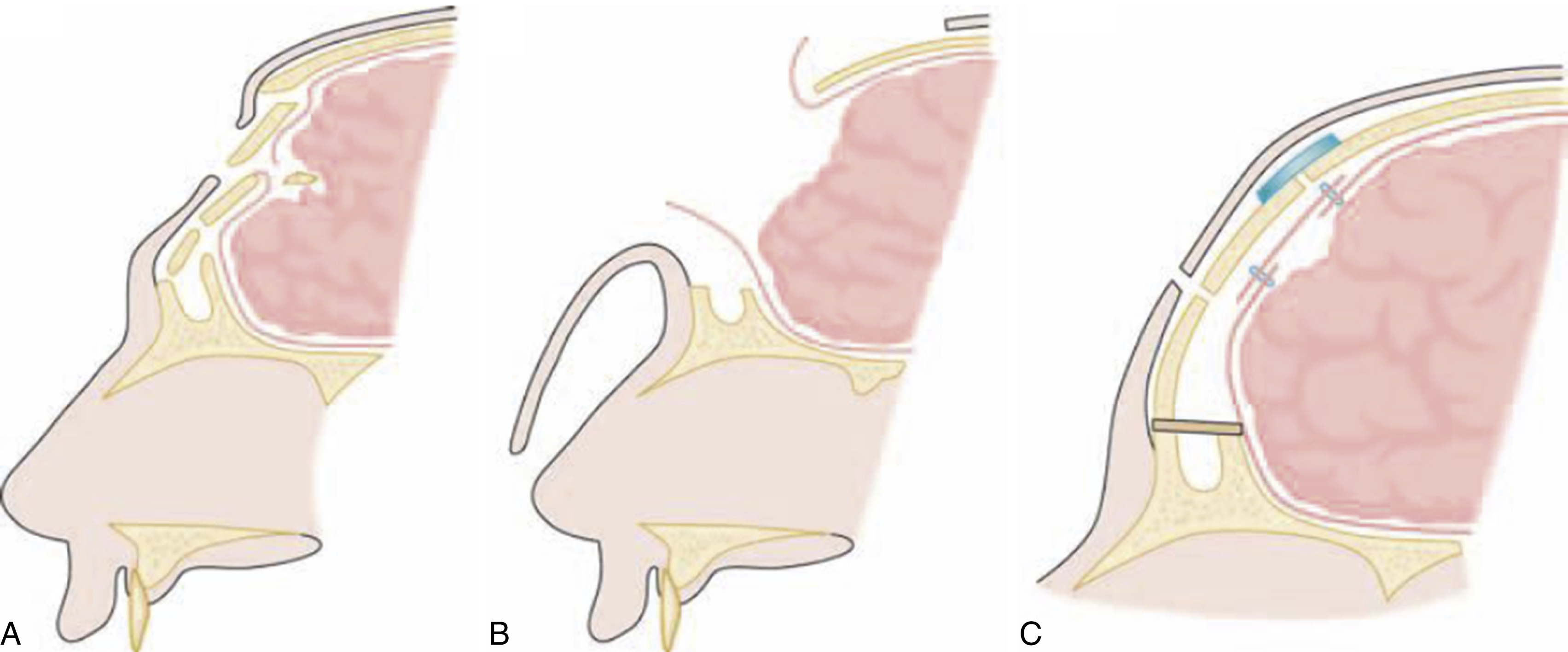 (A) When there is a compound comminuted depression of the frontal bone involving both tables of the sinus and tearing dura and/or brain, (B) the coronal flap exposes the area, the depressed fragments are removed, the area is gently cleansed, (C) the dura repaired, the posterior sinus wall removed, the sinus ostia blocked, and the frontal bone reconstructed with microplates or fine wires.