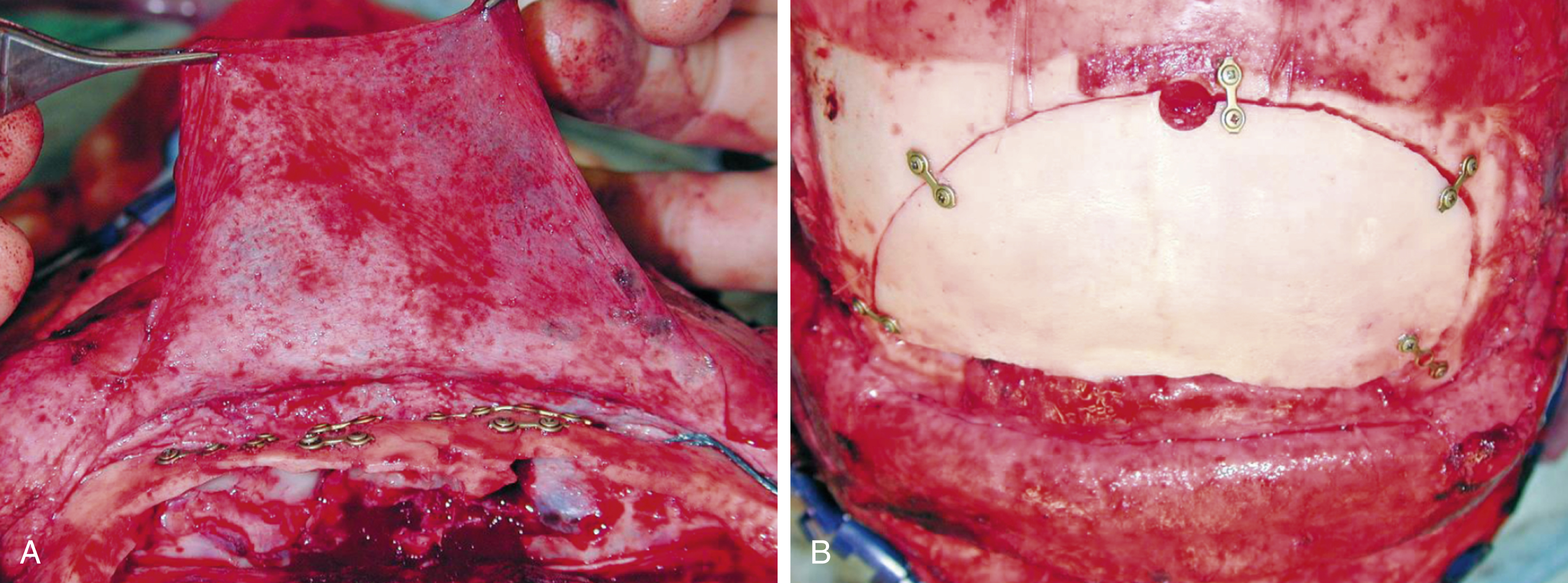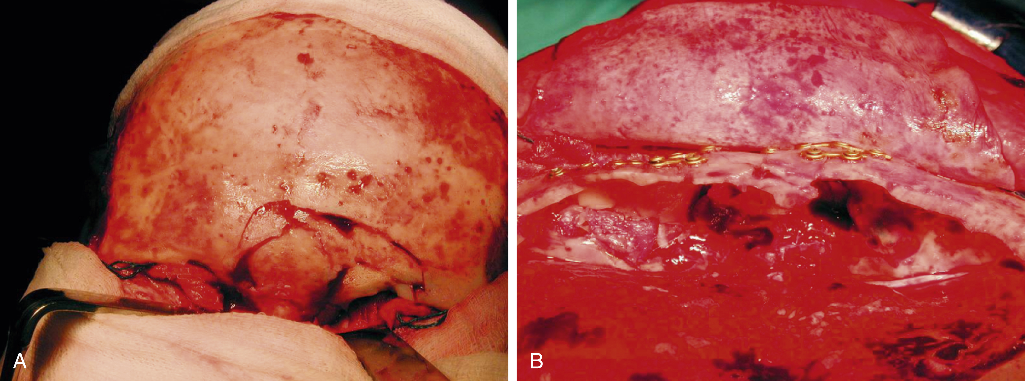 (A) The fracture exposed via the coronal flap. (B) The sinus has been cranialized, the dura repaired, and the outer table fragments plated.