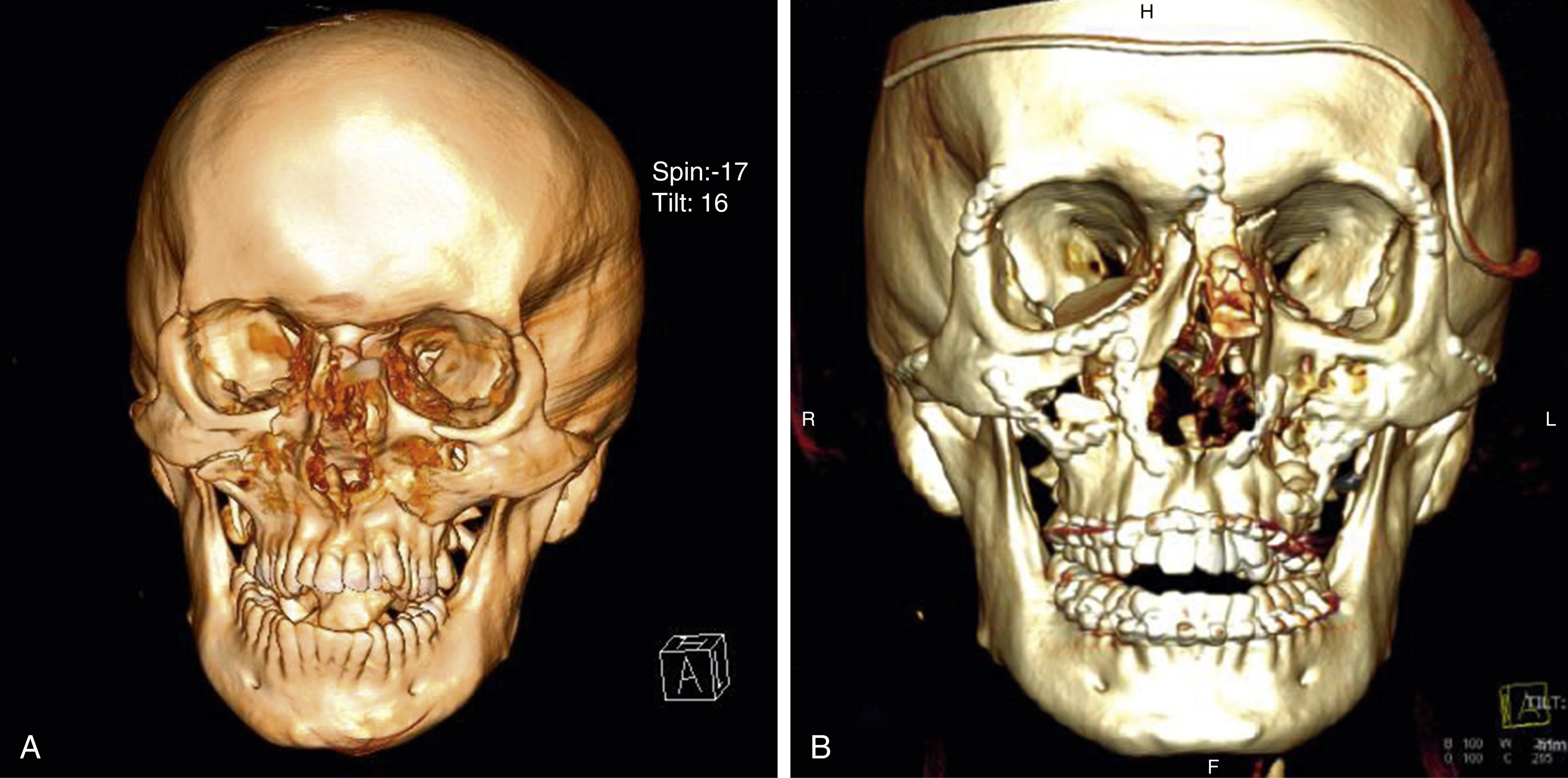 (A,B) A panfacial fracture where the naso-orbito-ethmoid complex has been repaired from posterior to anterior: the medial orbital walls grafted, the nasomaxillary processes plated, hence restoring the canthal ligaments, and a cantilever bone graft to the dorsum of nose to support the integument against collapse and contracture.