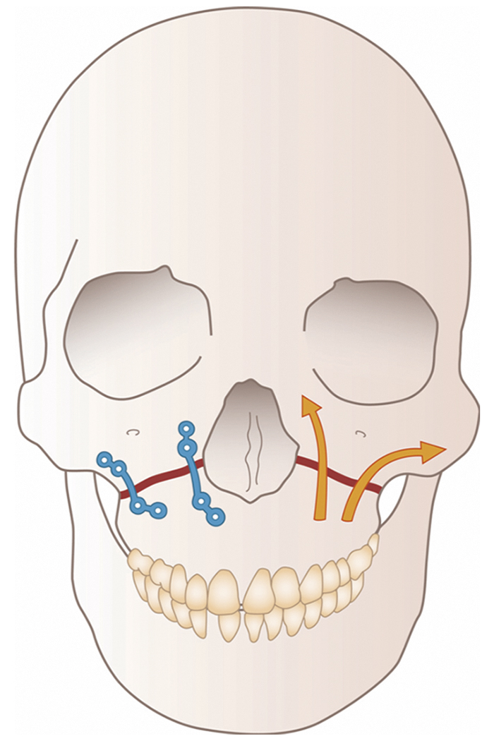 An intraoral upper buccal sulcus approach gives access to the arch and body of the bone which can be elevated and fixation can be made at the zygomatico-maxillary buttress. Because of the pull of the masseter muscle, it became common practice, in order to prevent relapse, to add fixation using a wire at the frontozygomatic suture. It is now standard practice to employ miniplate fixation. Miniplate or microplate fixation together with wide operative exposure of the orbitozygomatic skeleton allows anatomical restoration of the zygomatic prominence with fewer positional disturbances of the globe, such as enophthalmos and vertical global dystopia.