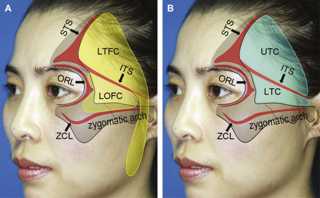 Surface projection of fat compartments ( A ) and septum compartments ( B ) in the temporal region as demonstrated on a 37-year-old female patient. ITS, inferior temporal septum; LOFC, lateral orbital fat compartment; LTC, lower temporal compartment; LTFC, lateral temporal cheek fat compartmentORL, orbital retaining ligament; STS, superior temporal septum; UTC, upper temporal compartment; ZCL, zygomatic cutaneous ligament.