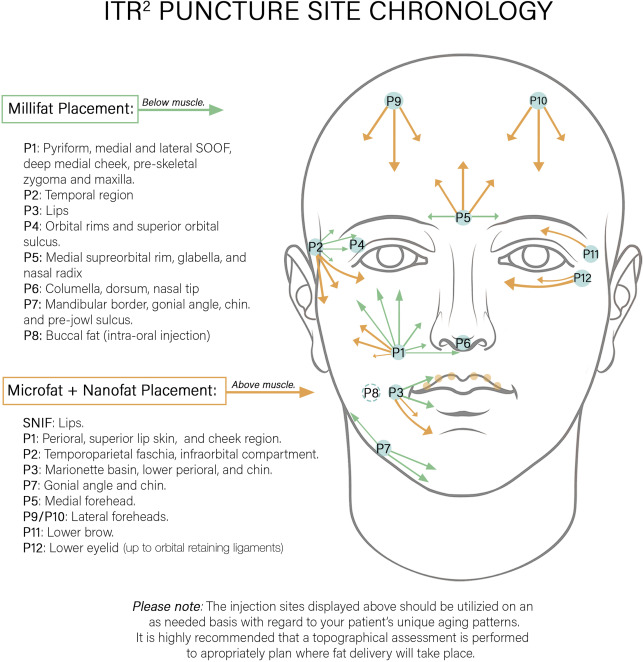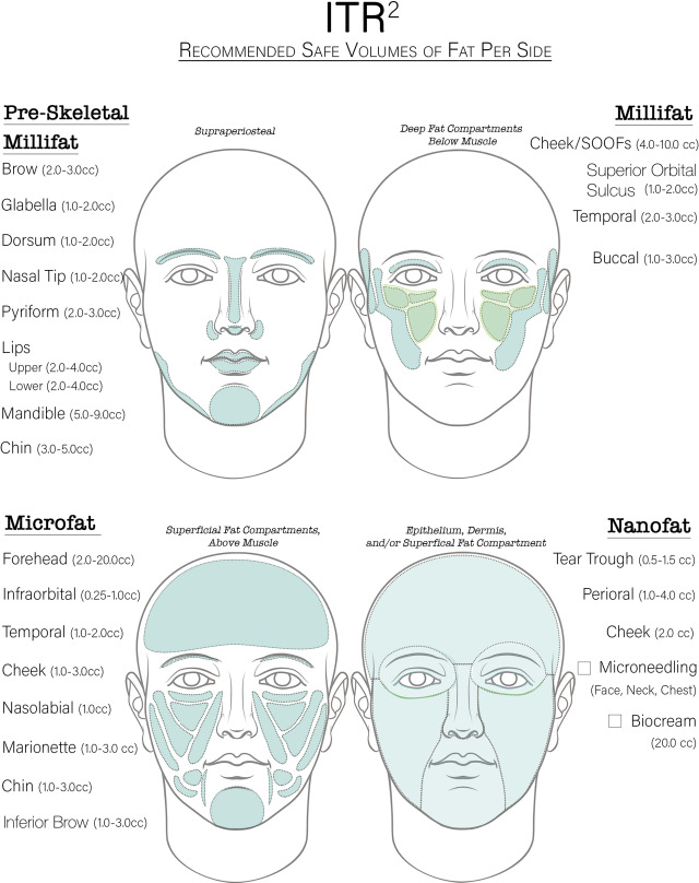 Injectable tissue replacement and regeneration (ITR 2 ) is a standardized fat grafting technique, which anatomically addresses losses of facial volume, laxity, and sun damage of the skin resulting from the natural processes of aging. Based on the structural differences of fat existing in the deeper versus the superficial fat compartments of the face, while accounting for skeletal losses and skin aging, ITR 2 utilizes 3 sizes of fat grafts—millifat (parcel size 2.0–2.5 mm), microfat (1.0 mm), and nanofat (<500 μm)—to replicate characteristics of fat cells lost with facial decay and provide increased blood supply and improvements in aging skin.